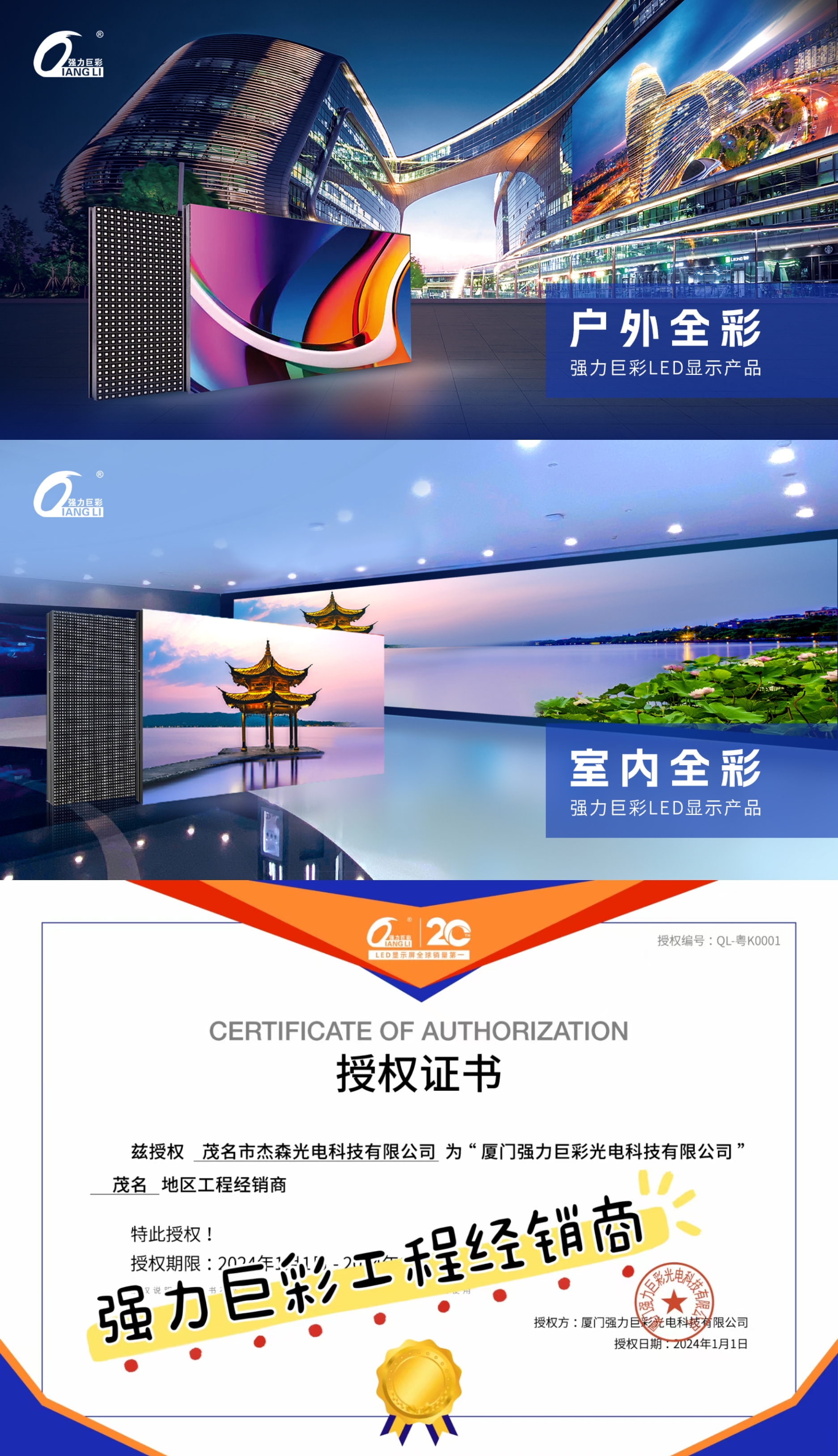 茲授權(quán)茂名市杰森光電科技有限公司為“廈門(mén)強(qiáng)力巨彩光電科技有限公司”茂名 地區(qū)工程經(jīng)銷(xiāo)商.
